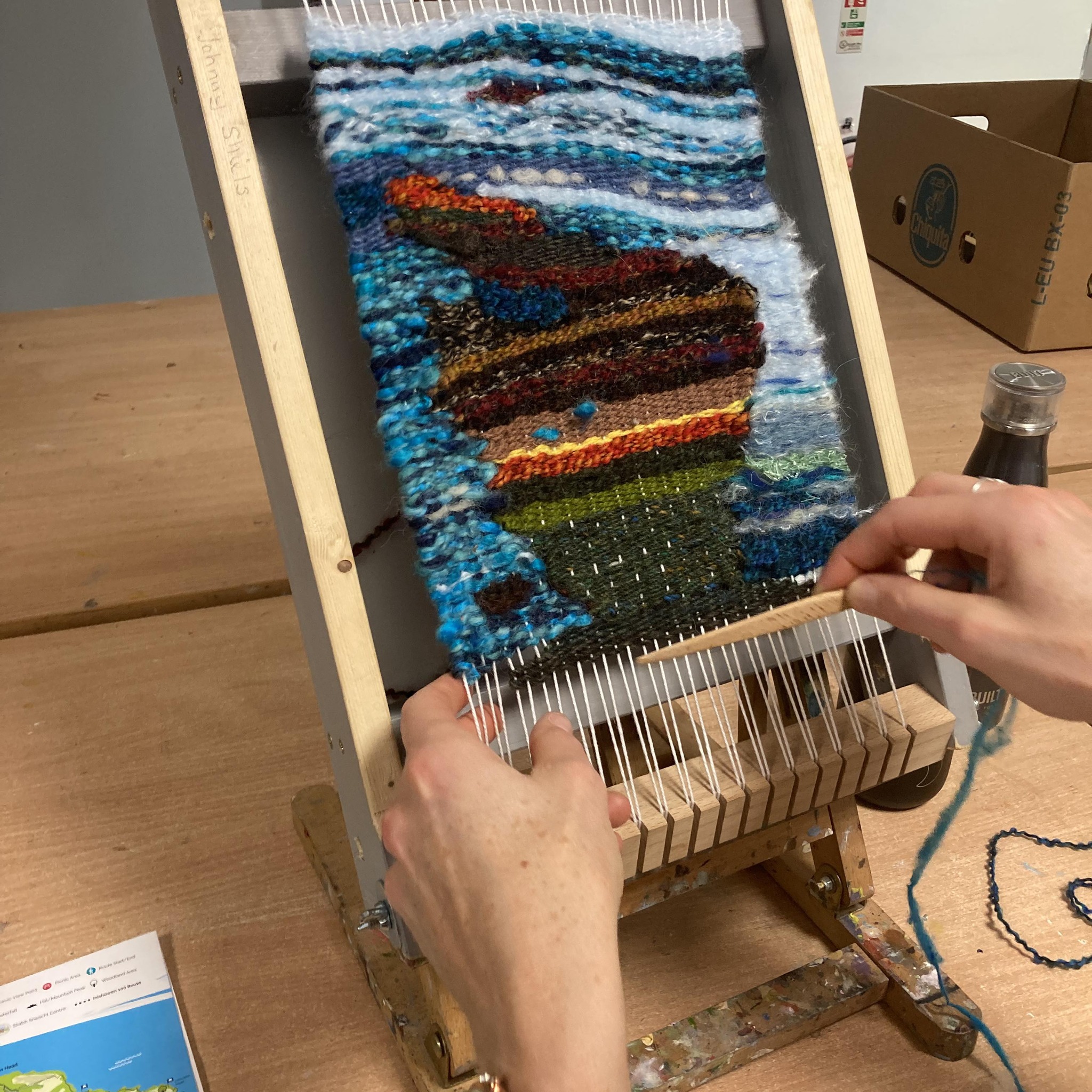 Pupils have a look at a table loom and learn how it works including the parts and terms used in weaving e.g.: heddle bar, reed, warp and weft and different weaves/patterns e.g.: herringbone, houndstooth. Using a board loom pupils put on their own warp and using a variety of weft fiber weave a piece of material e.g.: a wall hanging or headband.
